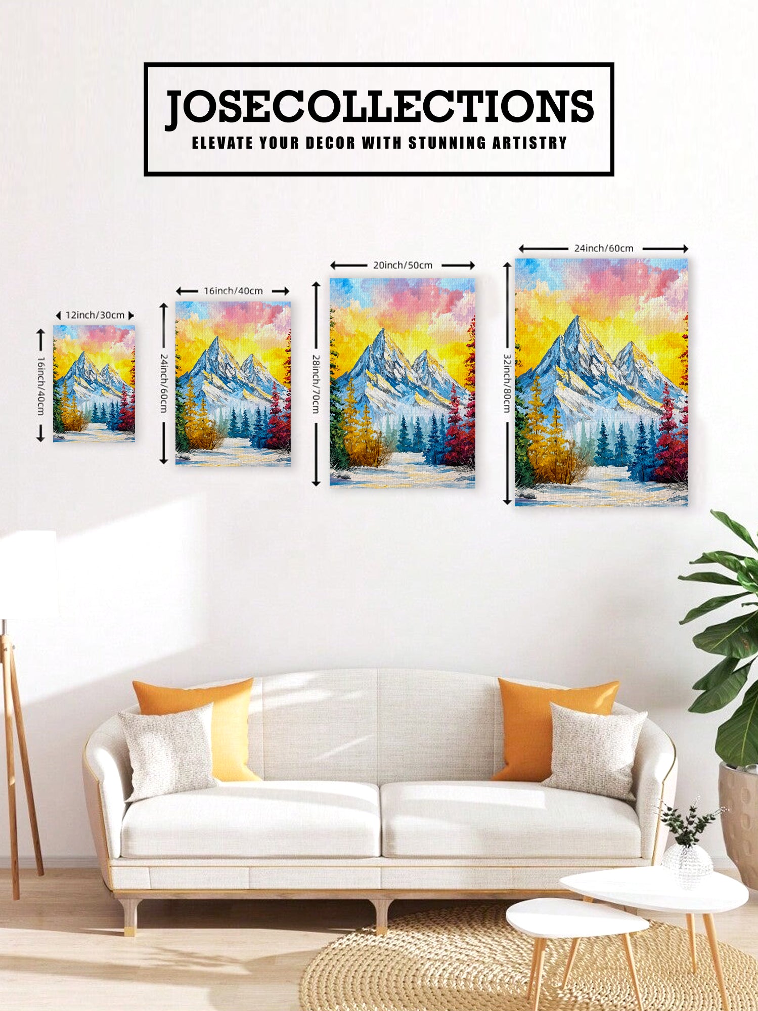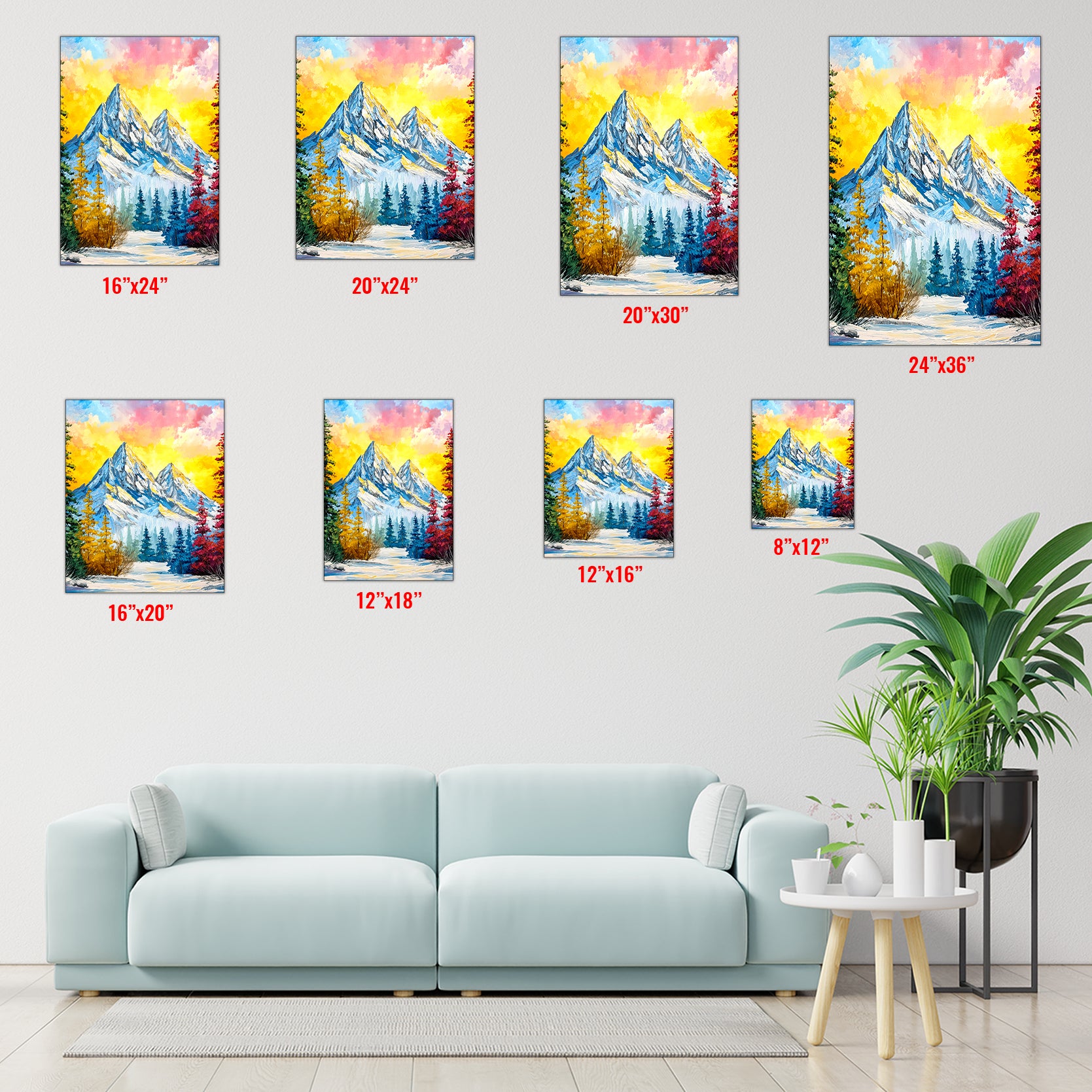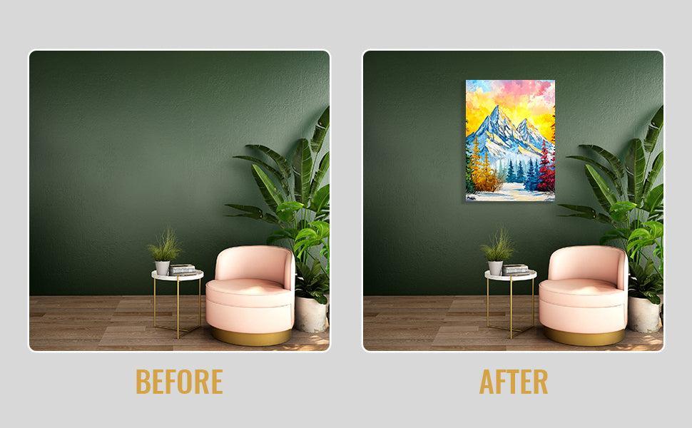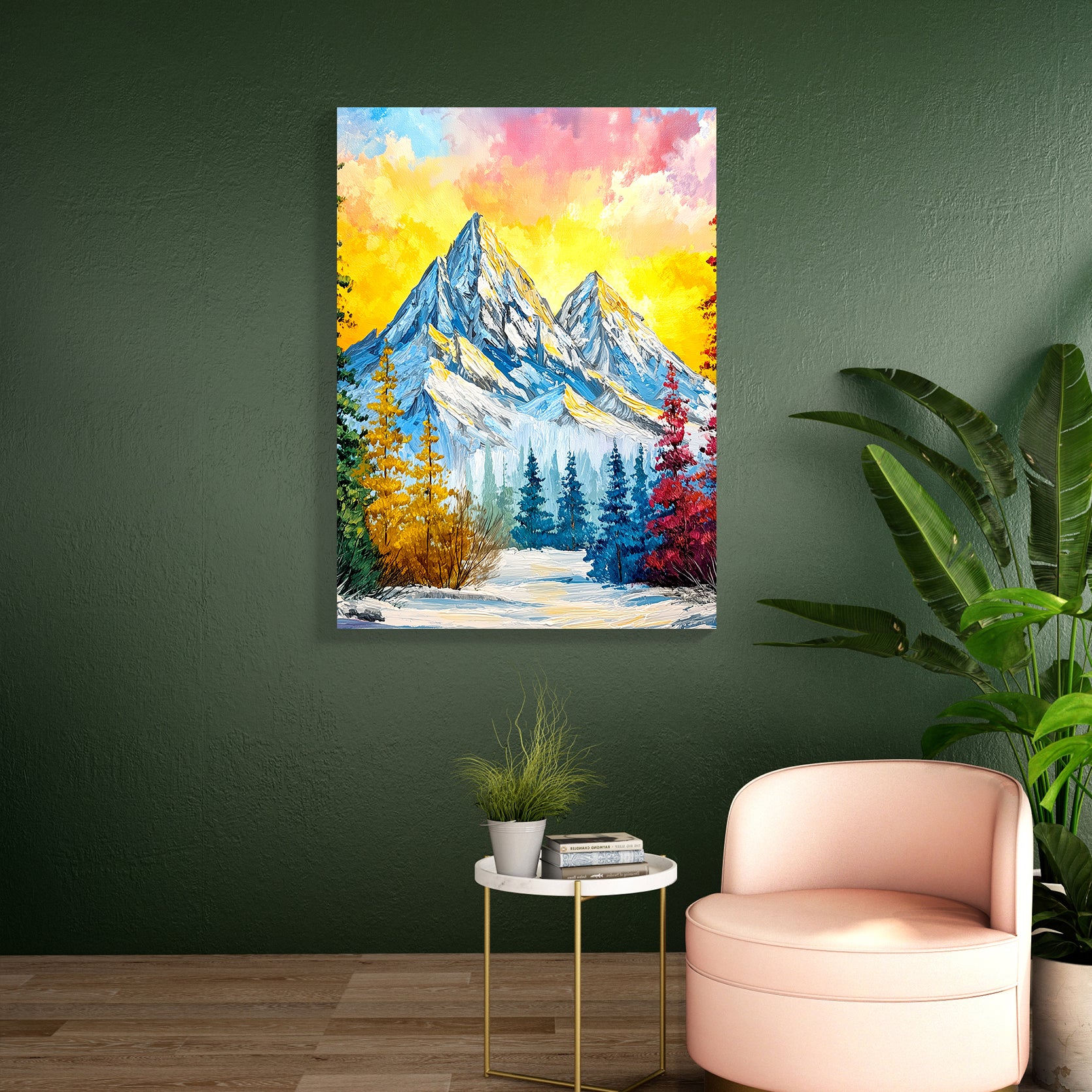 Elevate your interior with this striking impasto mountain landscape canvas print, where bold brushwork and dynamic color create visual depth and movement. The composition captures a dramatic sunset over snow-capped peaks, rendered in vibrant hues that command attention without overwhelming your space. Perfect for living rooms, bedside walls, or above sofas, this artwork serves as a sophisticated focal point that transforms any room into a gallery-worthy setting. The textured impasto technique adds tactile dimension, making the piece feel like an original painting rather than a standard print. Ideal for collectors seeking contemporary landscape art with personality and presence.