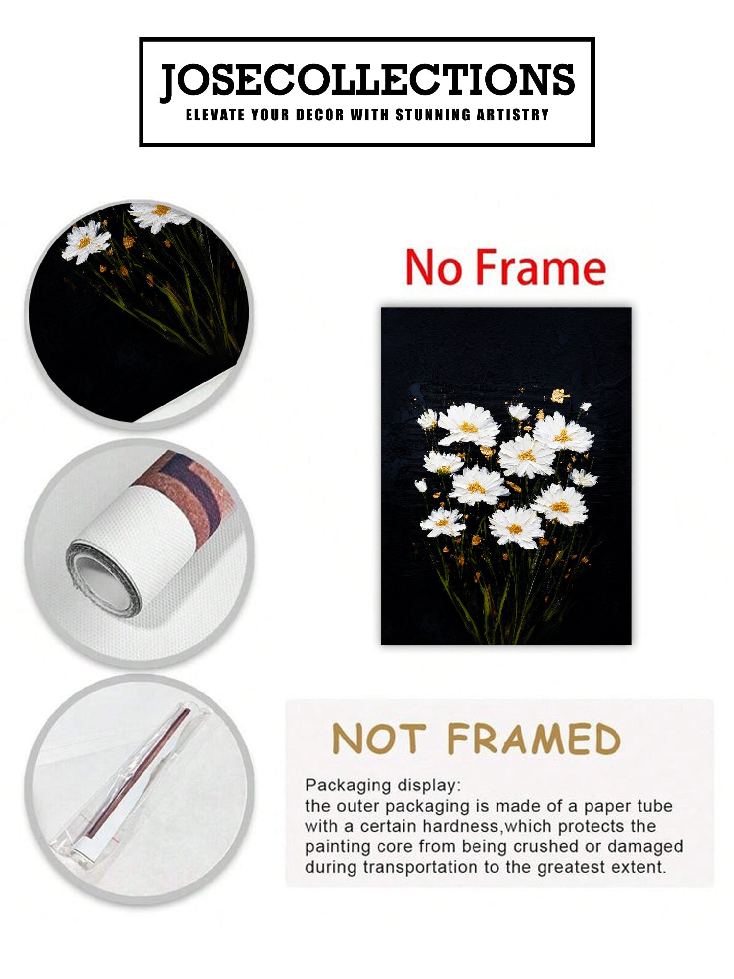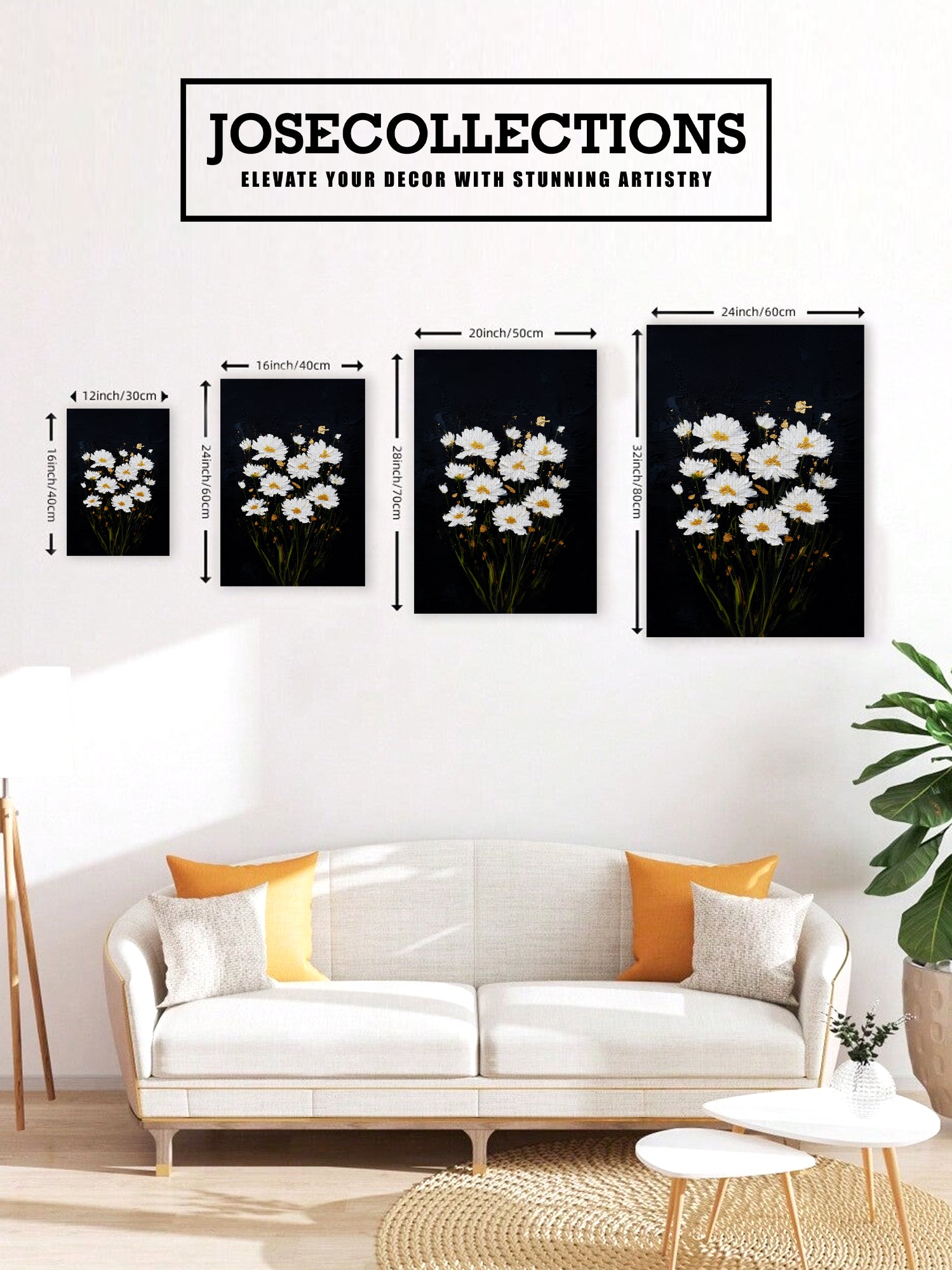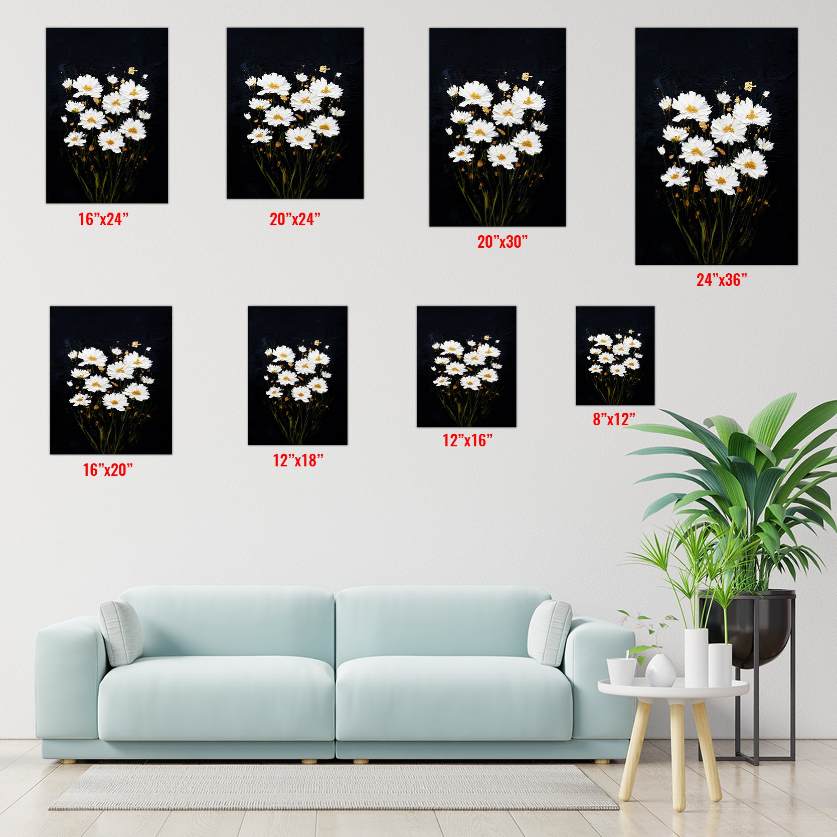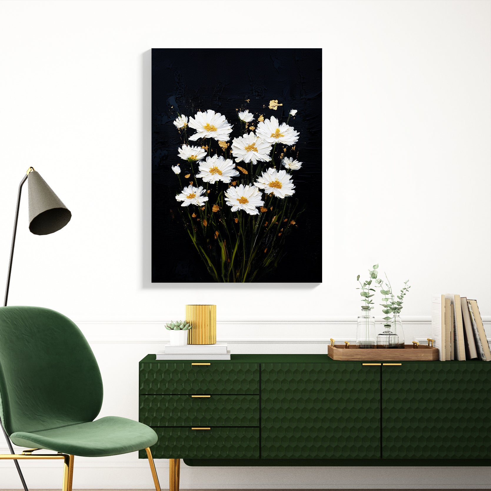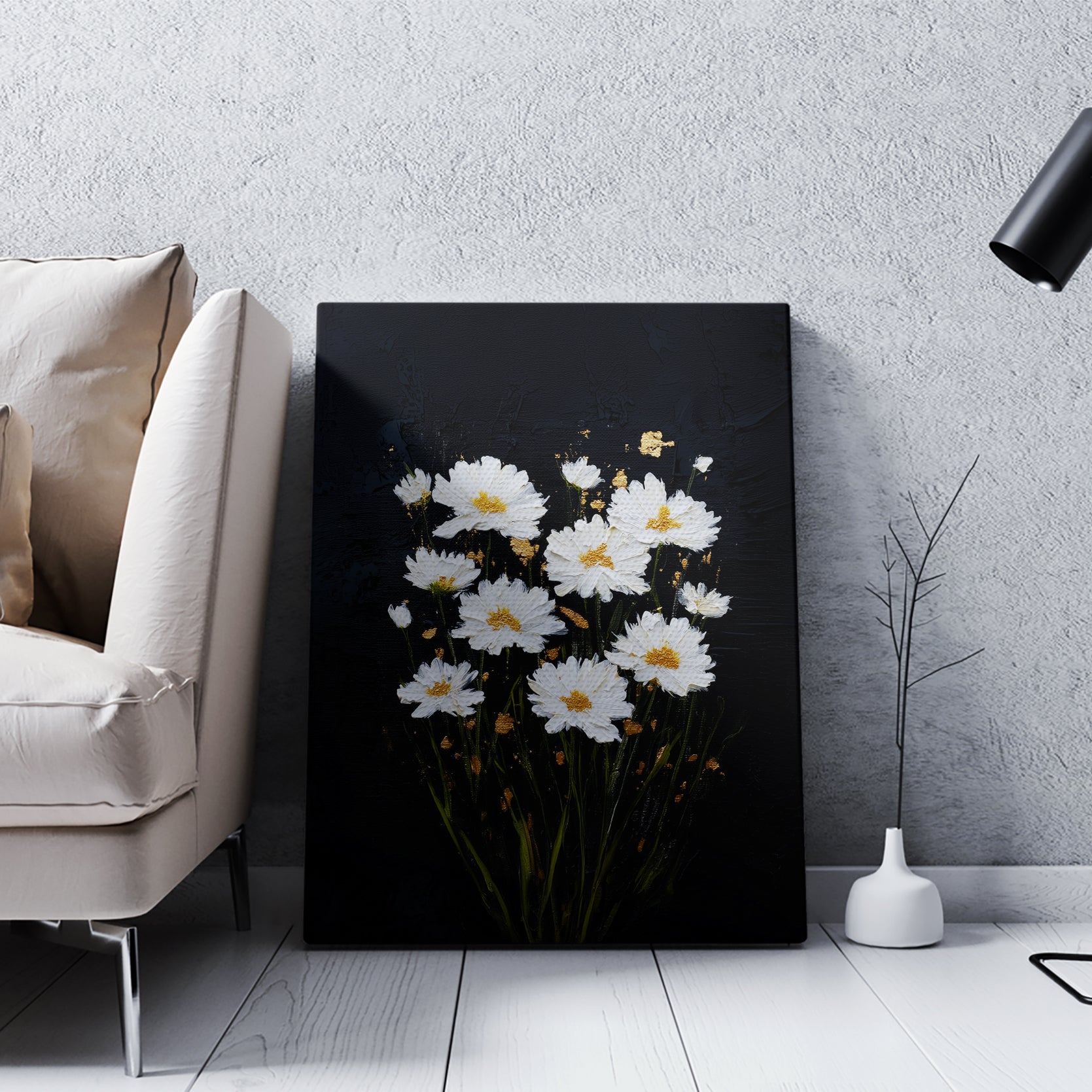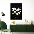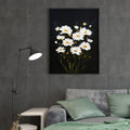 White daisies bloom against a striking black canvas, creating a sophisticated contrast that elevates any interior space. This wall art piece combines botanical elegance with modern minimalism, making it an ideal focal point for living rooms, bedroom walls, or above sofas. The crisp white florals draw the eye while the dark background grounds the composition, adding depth and visual interest without overwhelming your décor. Perfect for those seeking to introduce nature-inspired artistry with contemporary appeal, this canvas brings timeless charm and refined aesthetics to your home environment.