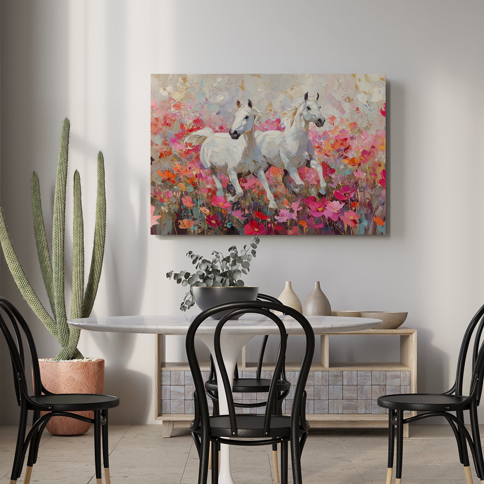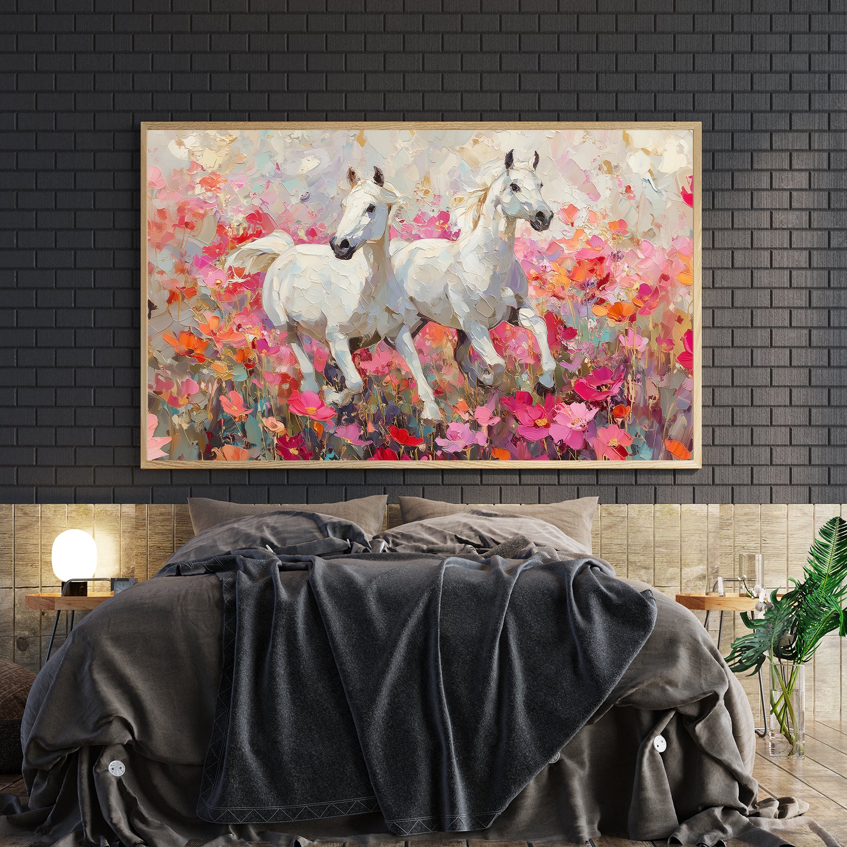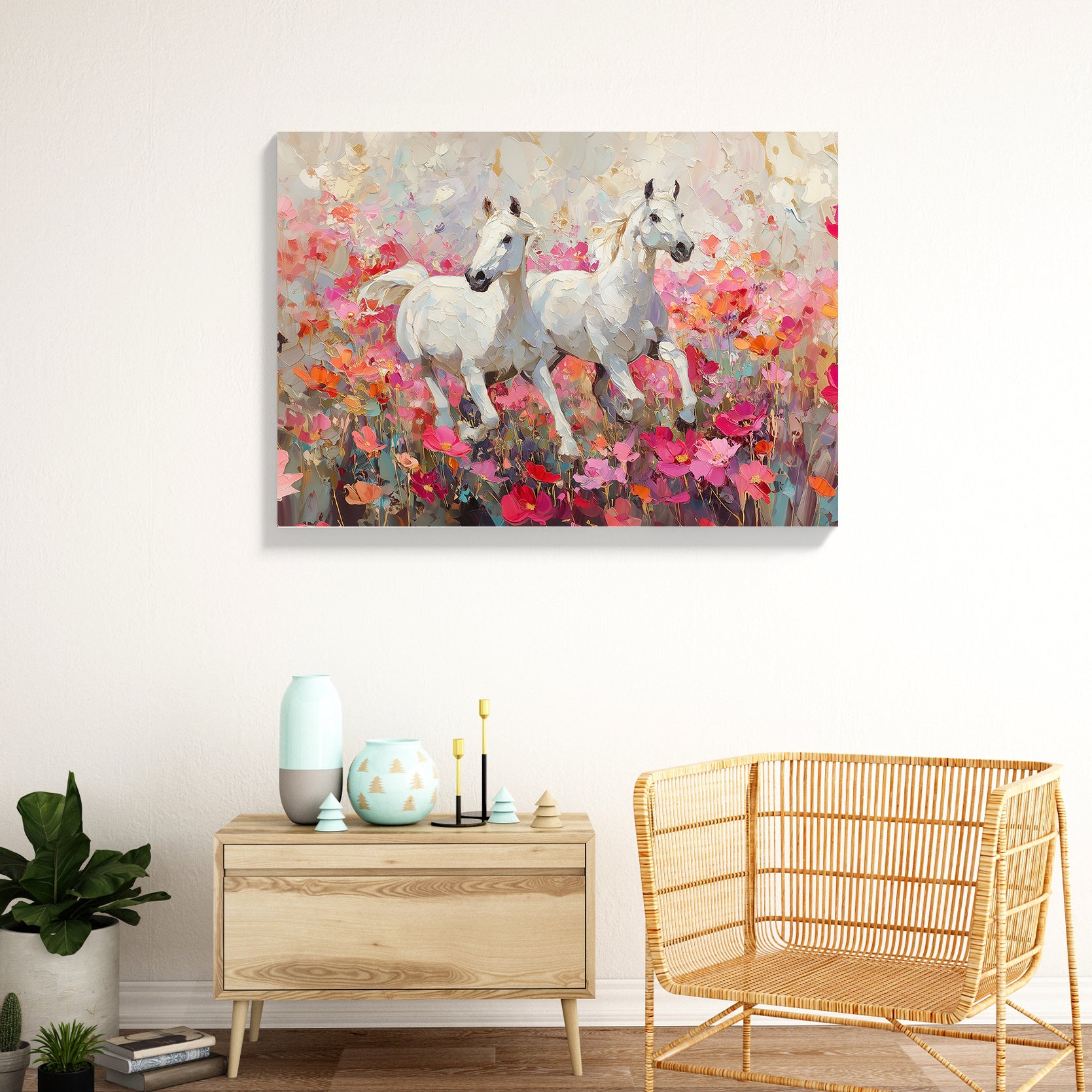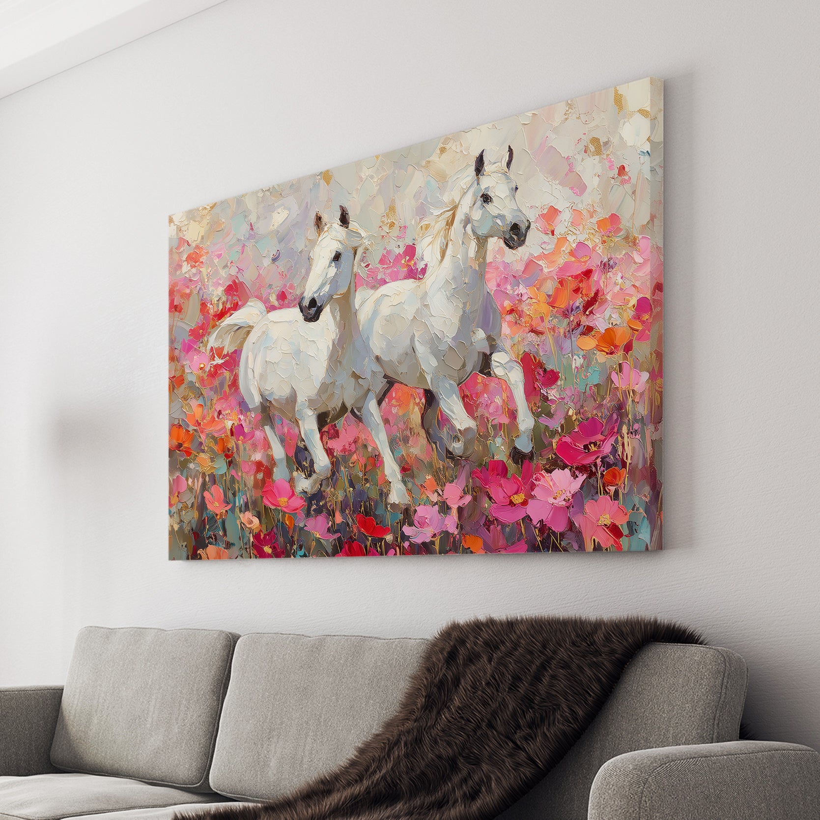 White Horses in Floral Field Canvas Wall Art, Pink Poppies Painting - For Living Room, Sofa Backdrop, Bedside Decoration, Home Decor