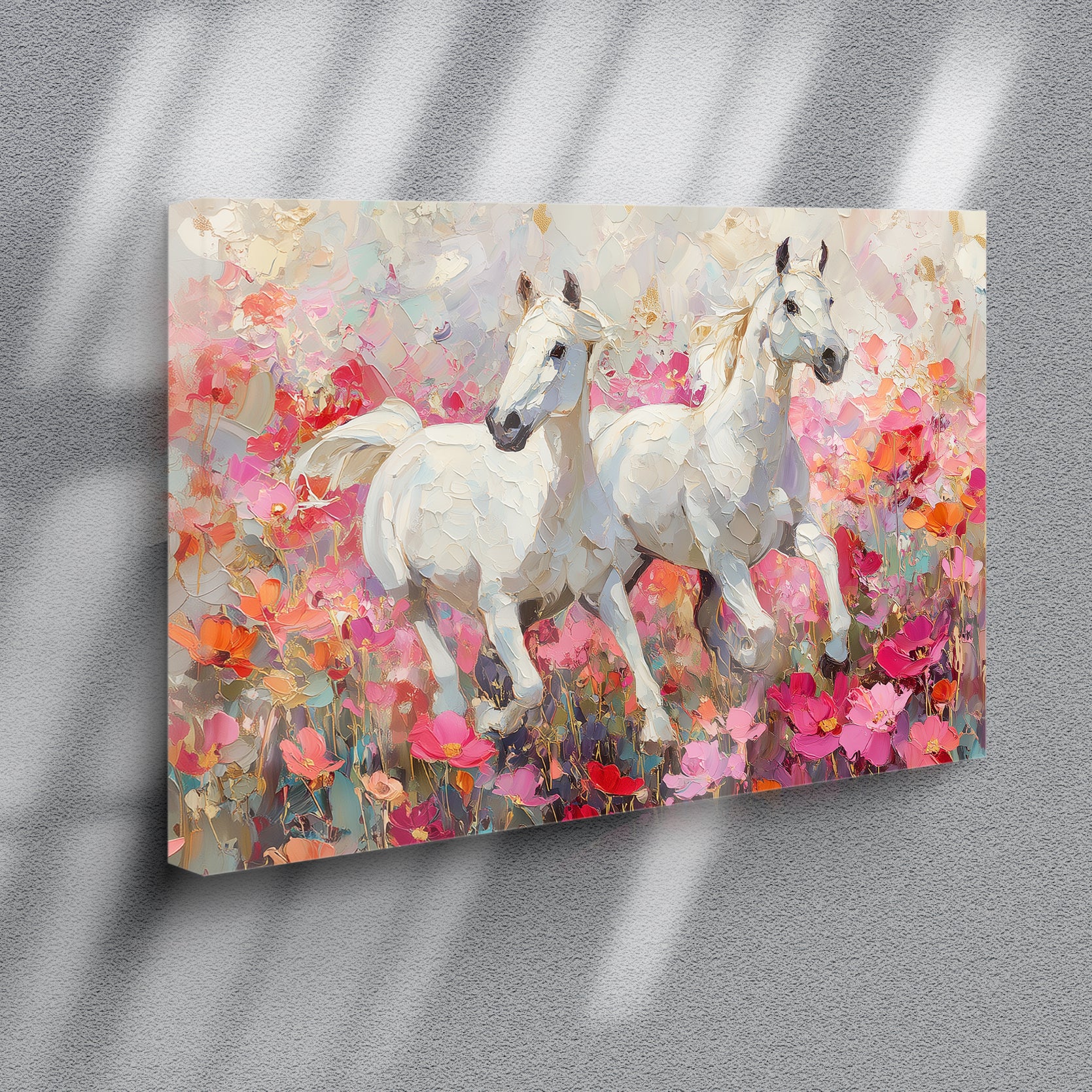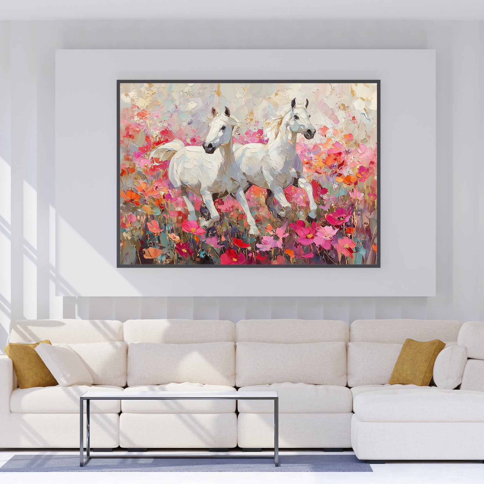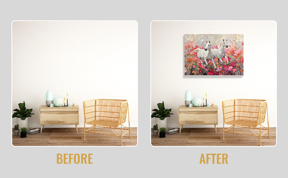 Elevate your living space with this exquisite canvas wall art featuring white horses gracefully set against a vibrant field of pink poppies. Perfectly suited for living rooms, sofa backdrops, or bedside decoration, this painting adds a serene and elegant touch to your home decor. The detailed imagery and soft color palette create a calming atmosphere, making it an ideal focal point that blends nature’s beauty with artistic sophistication. Crafted to enhance any interior, this piece brings both charm and tranquility to your environment.