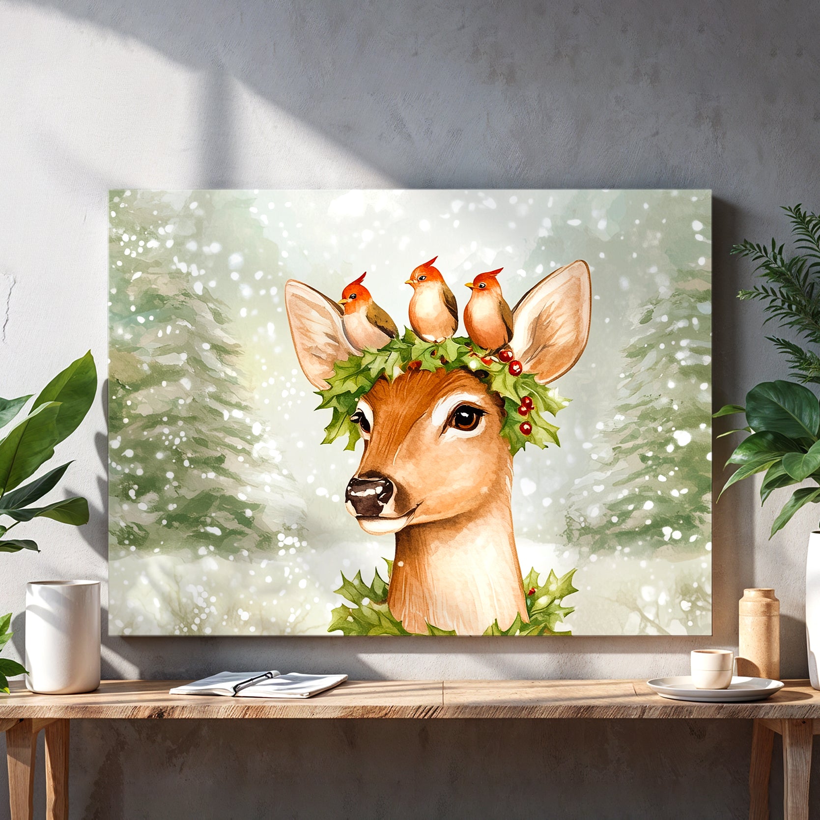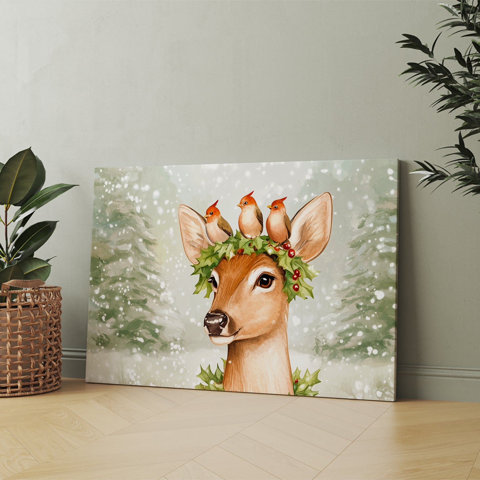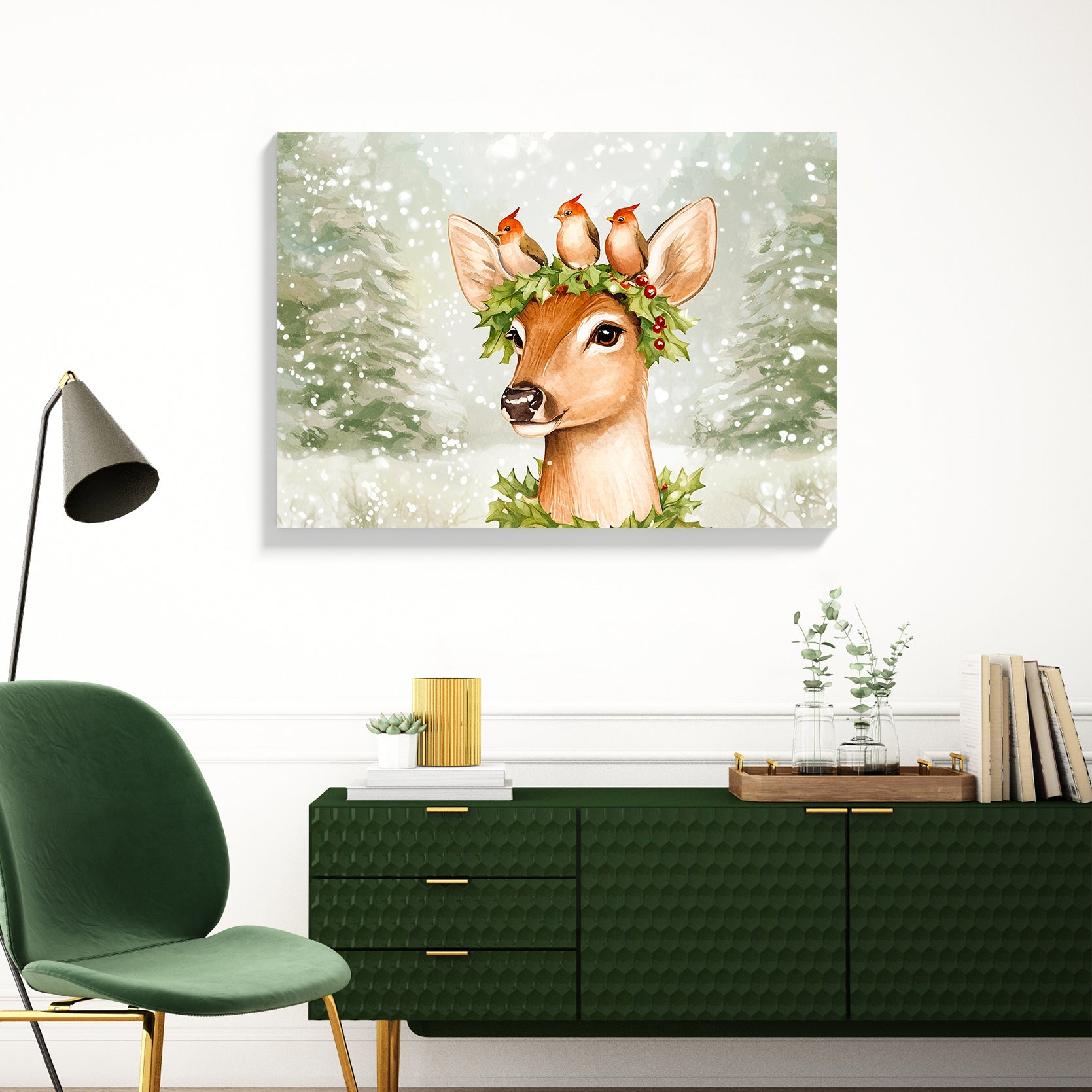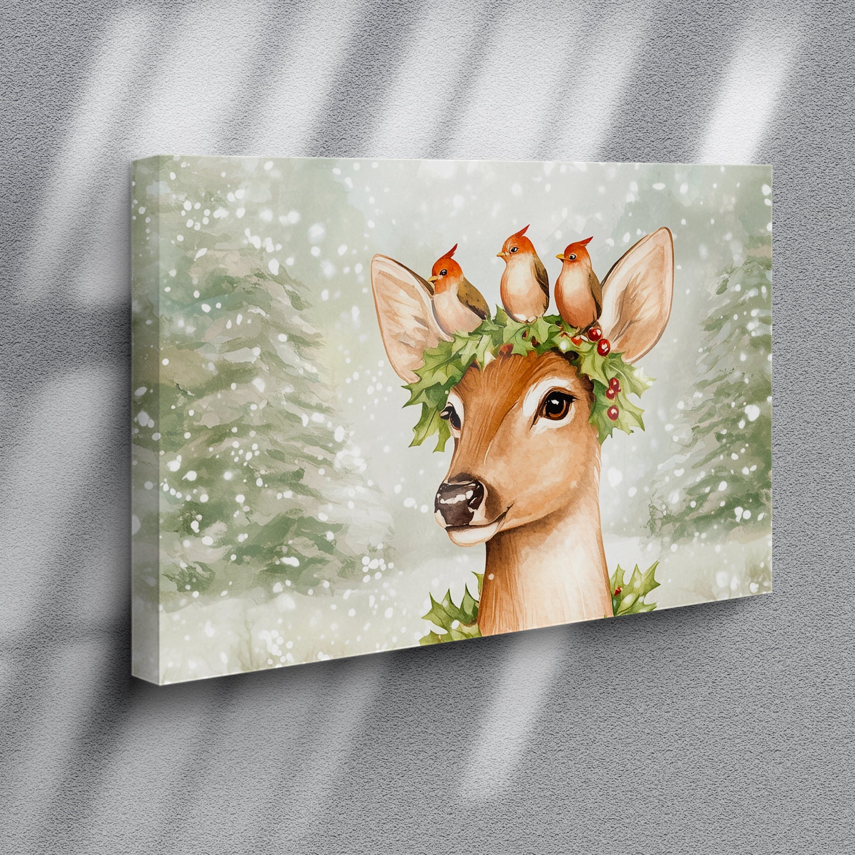 Transform your space into a winter wonderland with this captivating canvas wall art featuring a majestic deer adorned with a festive holly wreath and accompanied by vibrant cardinals. This expertly crafted piece combines seasonal charm with timeless elegance, making it an ideal focal point for your living room, above your sofa, or beside your bed. The rich holiday palette and intricate details create visual depth that complements both traditional and contemporary interiors. Perfect for those seeking to elevate their home decor with meaningful seasonal artwork that celebrates the beauty of winter wildlife and festive traditions.
