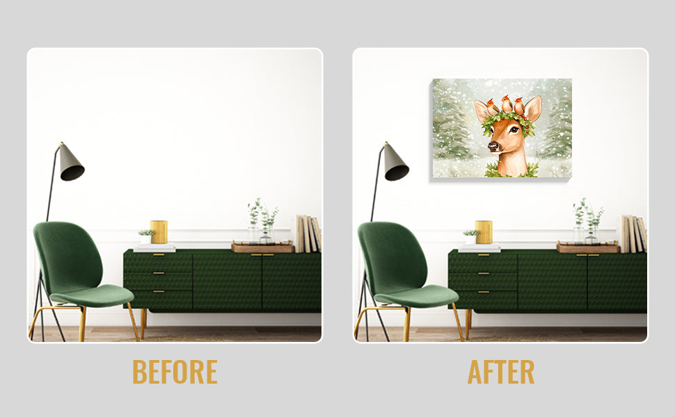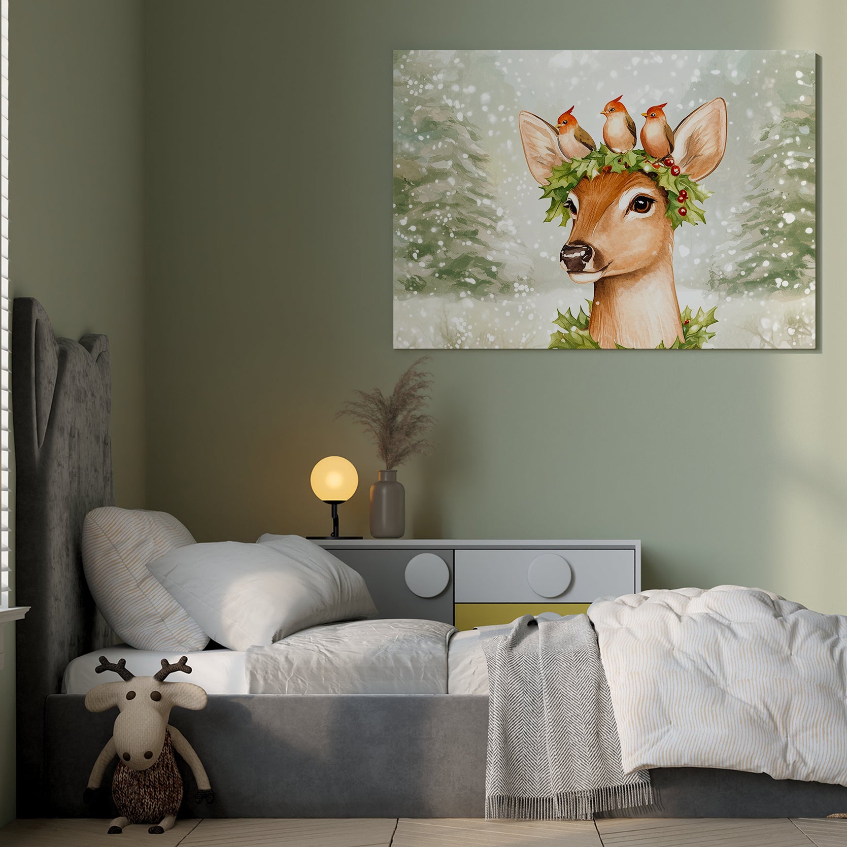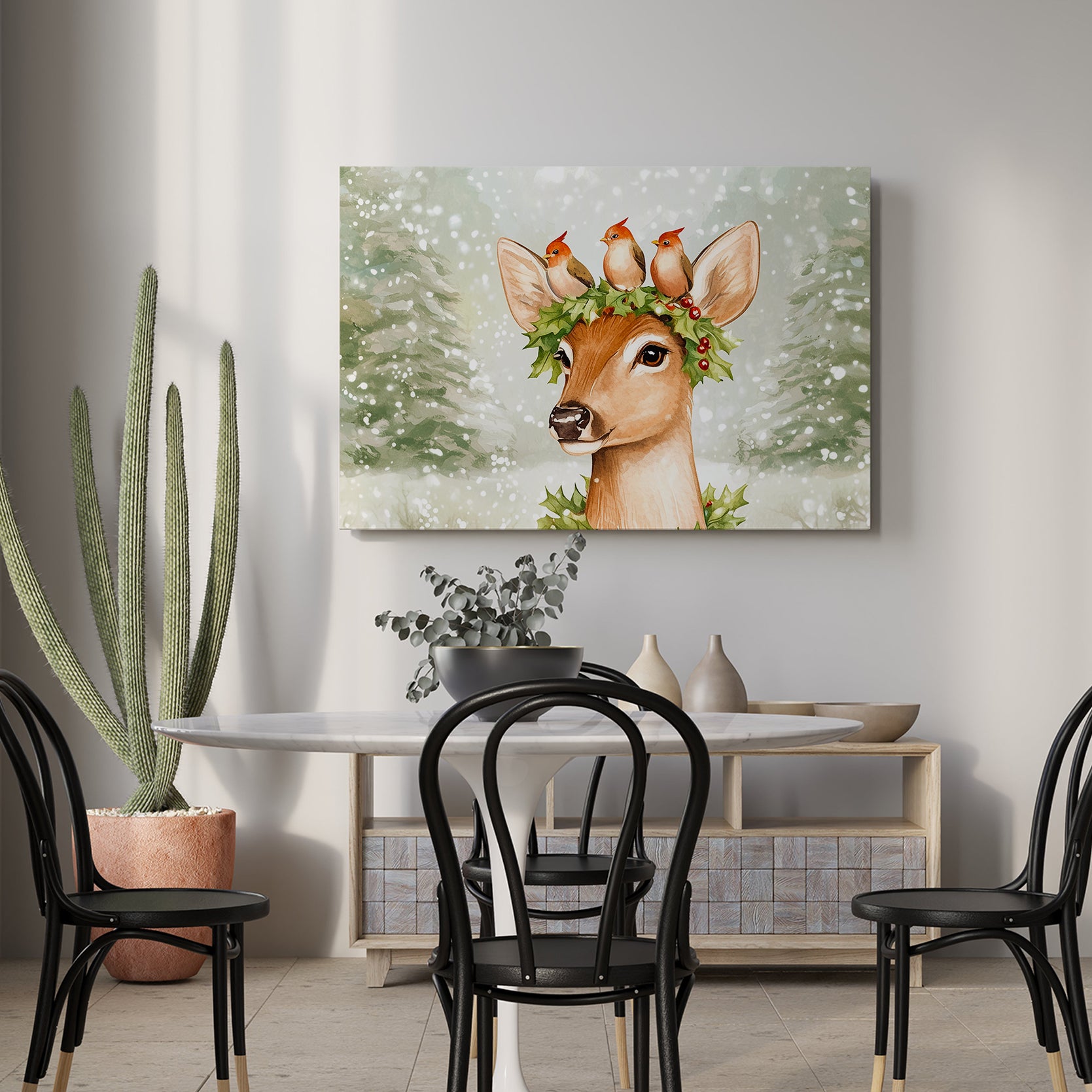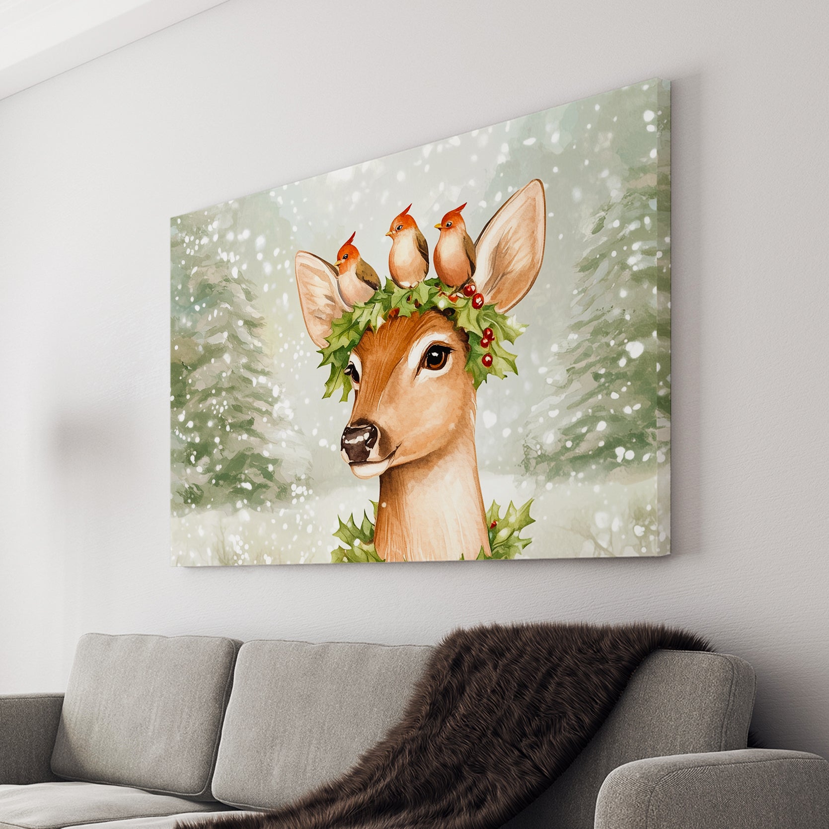 Transform your space into a winter wonderland with this captivating canvas wall art featuring a majestic deer adorned with a festive holly wreath and accompanied by vibrant cardinals. This expertly crafted piece combines seasonal charm with timeless elegance, making it an ideal focal point for your living room, above your sofa, or beside your bed. The rich holiday palette and intricate details create visual depth that complements both traditional and contemporary interiors. Perfect for those seeking to elevate their home decor with meaningful seasonal artwork that celebrates the beauty of winter wildlife and festive traditions.
