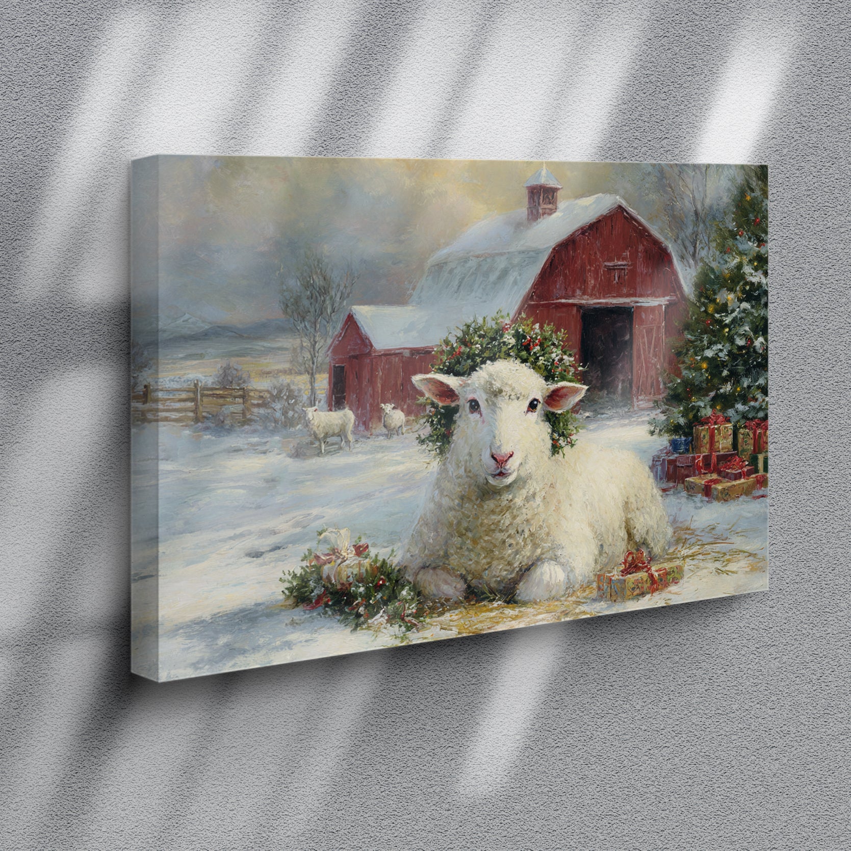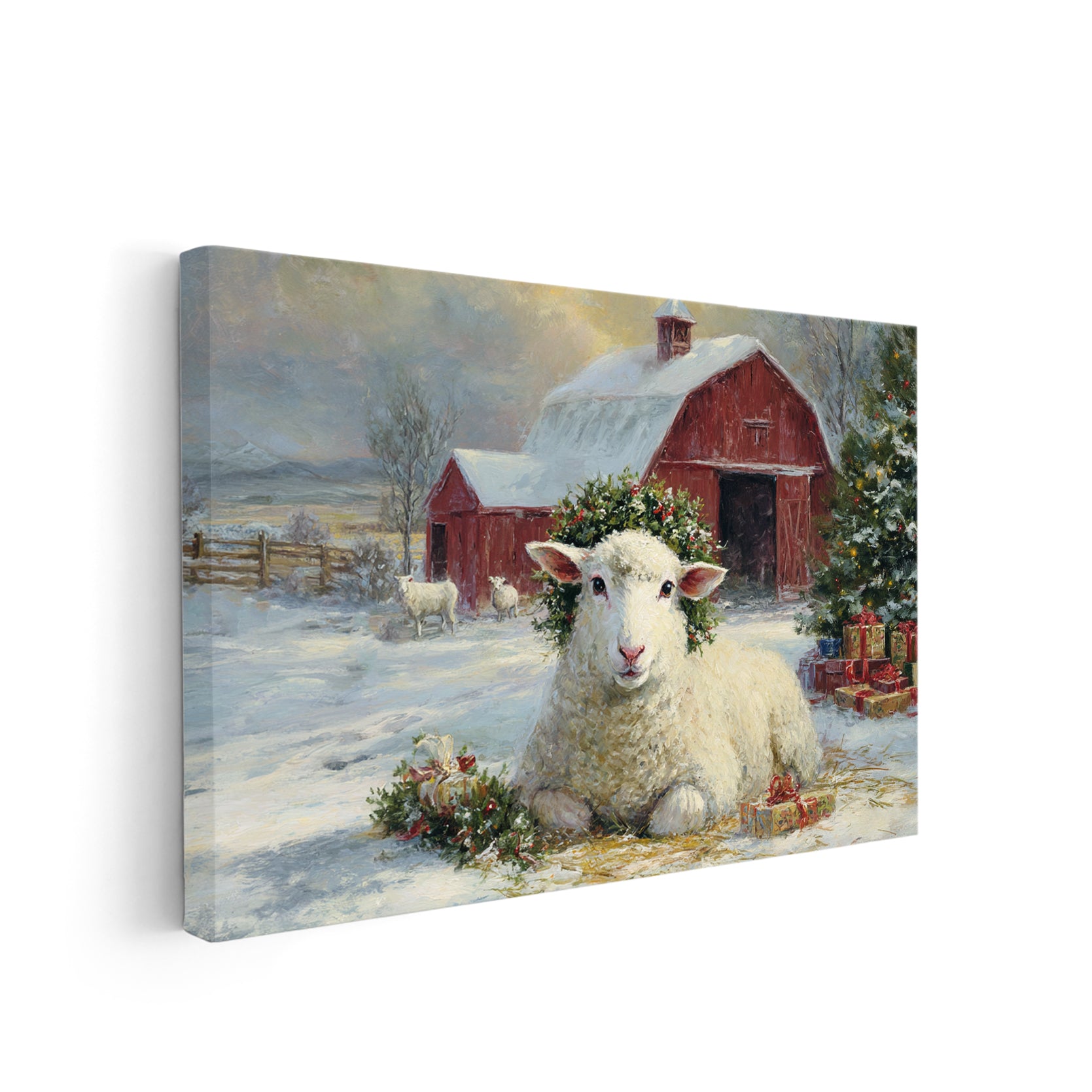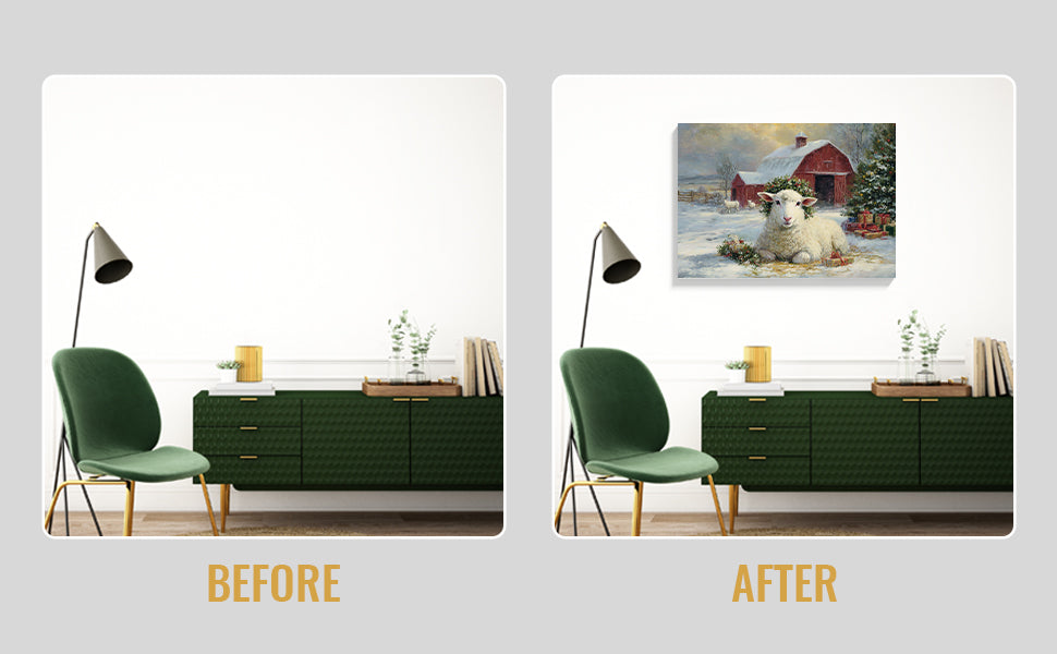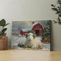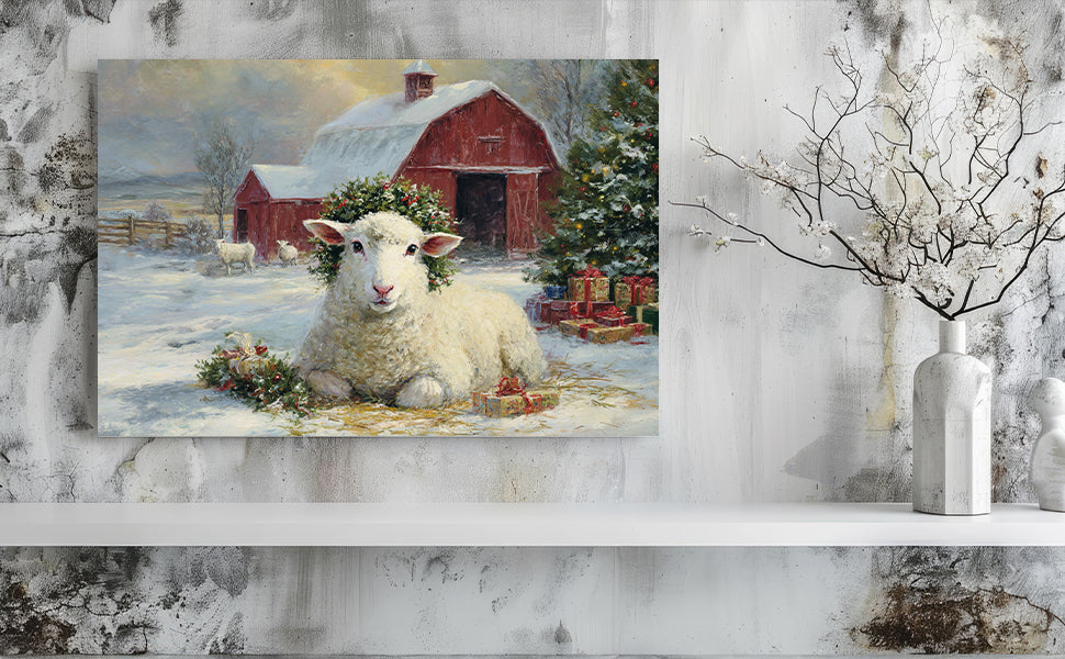Transform your space with this evocative winter landscape canvas. Featuring a charming red barn nestled in a snow-covered pastoral setting with grazing sheep, this piece captures the serene beauty of rural farmlife. The rich, warm tones of the barn contrast beautifully against cool winter whites, creating visual depth and interest. Perfect for living rooms, bedrooms, or any space needing a touch of rustic charm and countryside nostalgia. The timeless composition brings warmth and character to modern and traditional interiors alike, making it an ideal focal point above sofas, beds, or accent walls.
