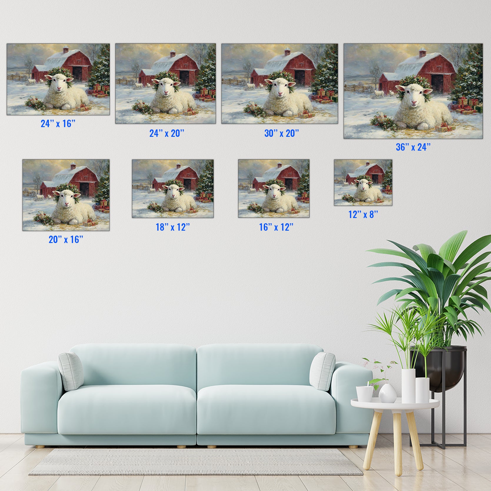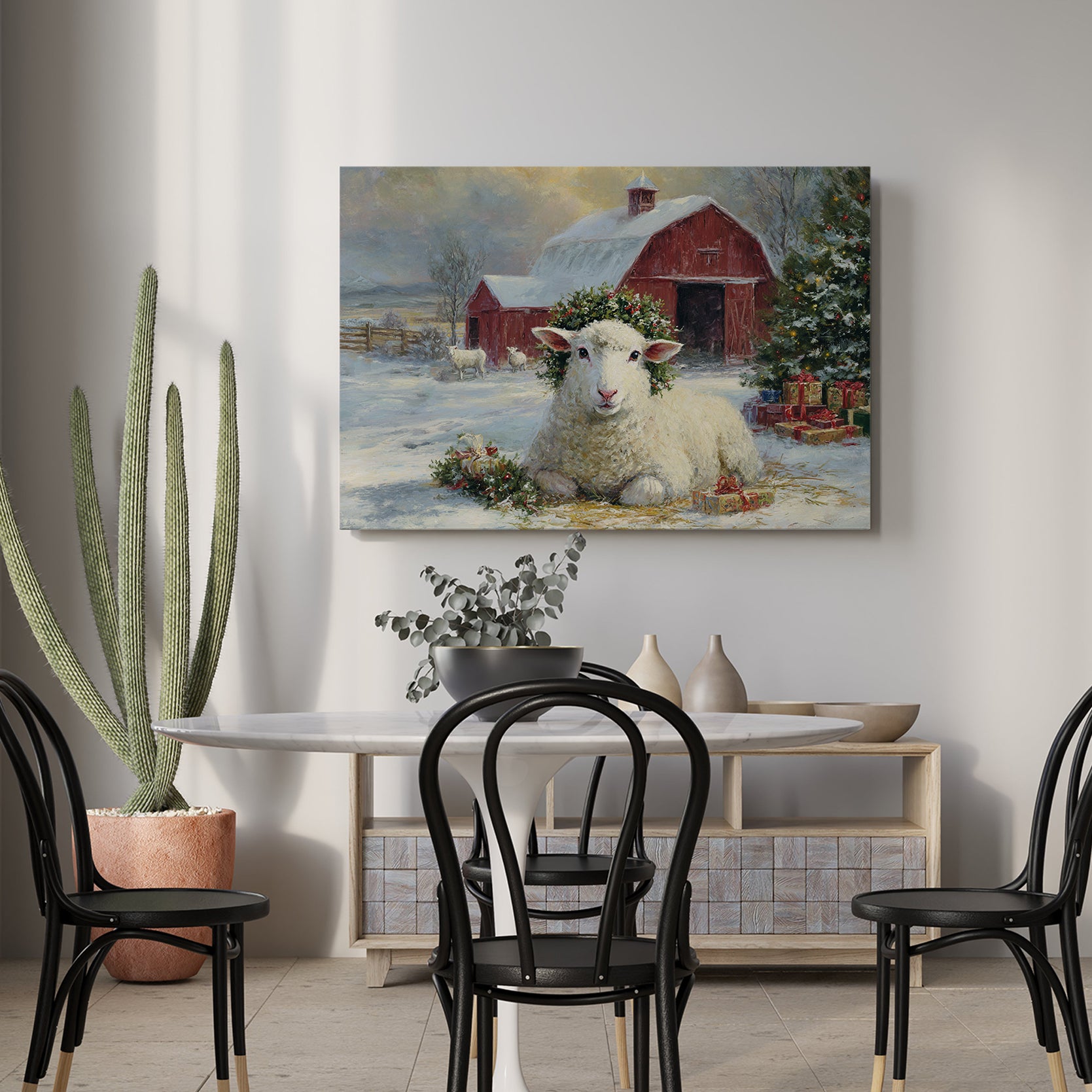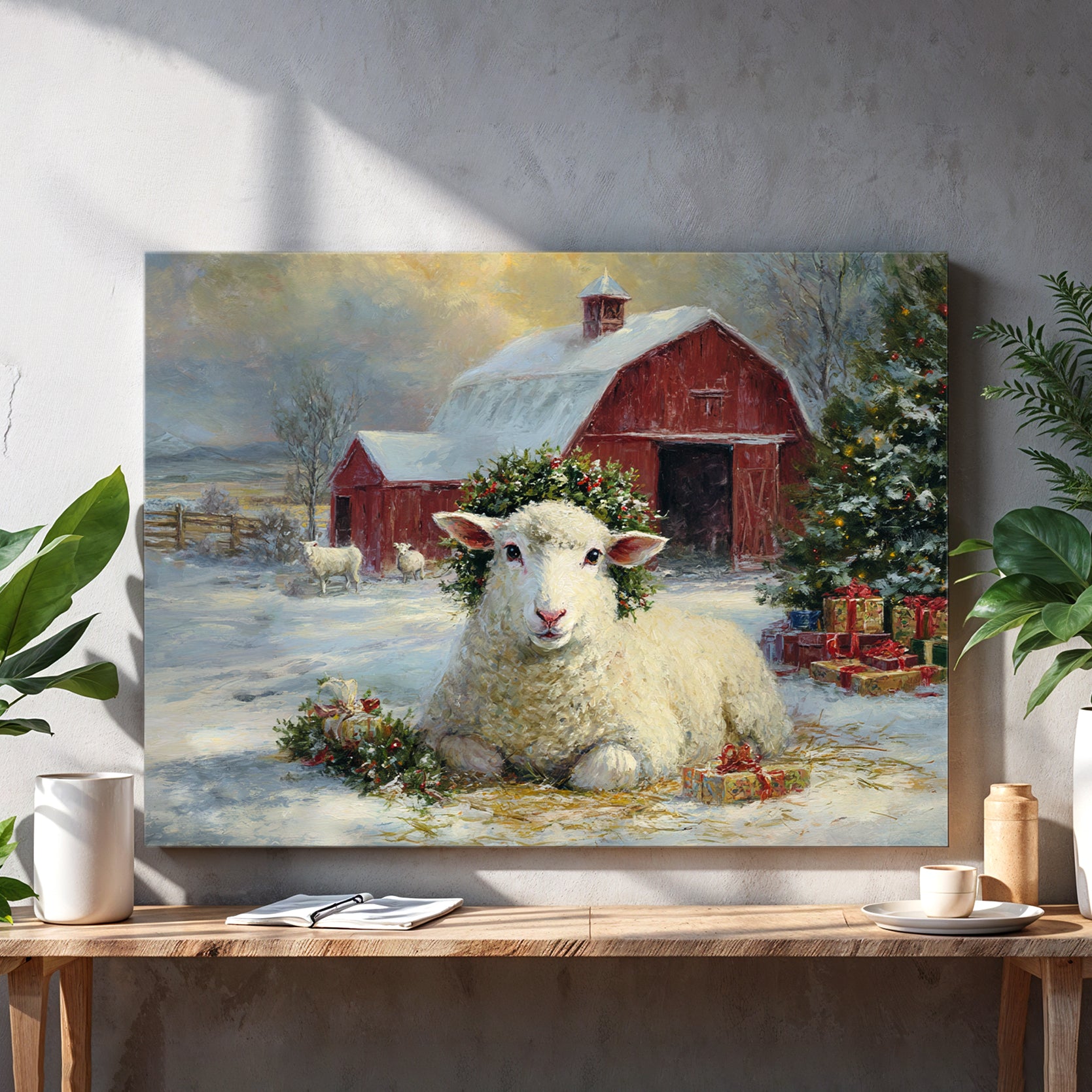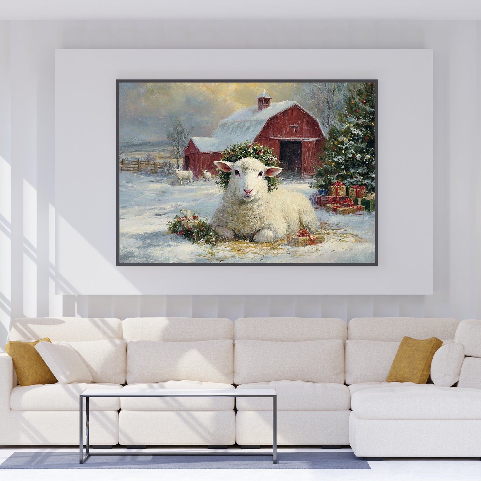 Transform your space with this evocative winter landscape canvas. Featuring a charming red barn nestled in a snow-covered pastoral setting with grazing sheep, this piece captures the serene beauty of rural farmlife. The rich, warm tones of the barn contrast beautifully against cool winter whites, creating visual depth and interest. Perfect for living rooms, bedrooms, or any space needing a touch of rustic charm and countryside nostalgia. The timeless composition brings warmth and character to modern and traditional interiors alike, making it an ideal focal point above sofas, beds, or accent walls.
