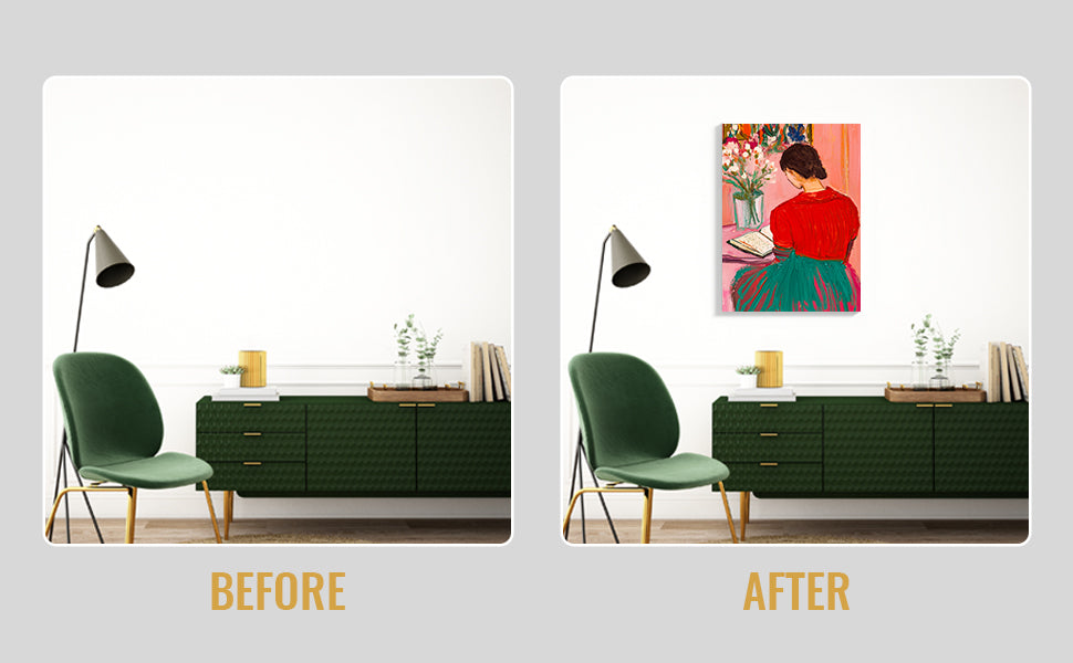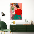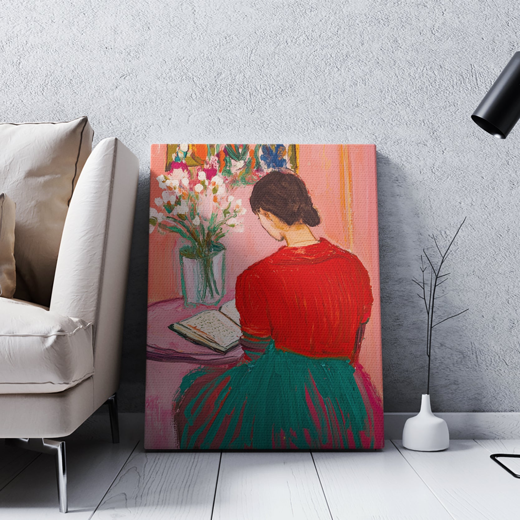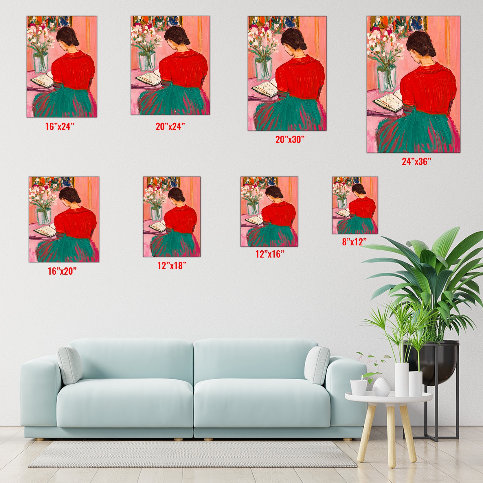 Elevate your interior with this striking canvas wall art featuring a contemplative woman reading portrait rendered in sophisticated red and pink tones. The modern artistic style brings contemporary elegance to any space, making it an ideal focal point above your sofa, in the bedroom, or throughout your home. The warm color palette creates an inviting atmosphere while the expressive brushwork adds depth and character to your walls. Perfect for those seeking to infuse their living spaces with artistic sophistication and visual interest. This versatile piece complements both modern and eclectic décor schemes, transforming ordinary walls into a gallery-worthy display.